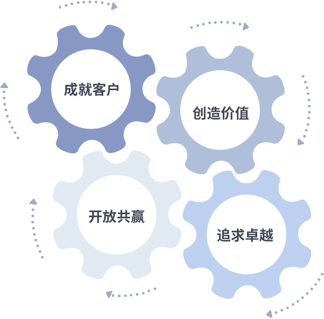 成就客户是一切决策的出发点,创造价值是衡量所有工作的标准,追求卓越是狗万做事做人的态度,开放共赢是狗万的格局也是最终的结果。价值观的齿轮环环相扣,推动着组织里的每个人不断向前。